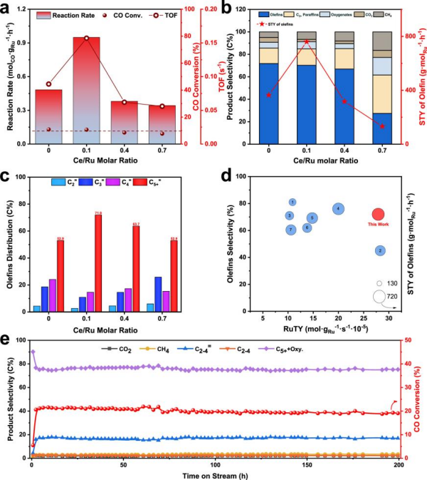 合成气转化是连接生物质、天然气、煤炭、CO₂等各类含碳资源与清洁油品和高附加值化学品的重要平台技术,其产物涉及汽/柴/煤油等液体燃料,以及低碳烯烃、α-烯烃、芳烃、甲醇、高碳醇等基础化工原料或高附加值化学品。其中,长链α-烯烃是合成聚烯烃级、PAO润滑油等关键原料,但基...