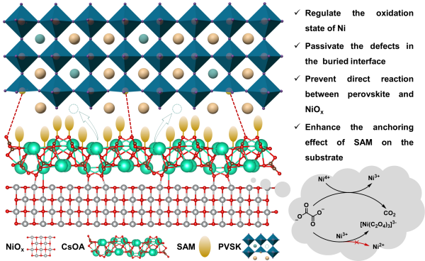 在倒置钙钛矿太阳能电池中氧化镍(NiOx)/自组装单分子层(SAM)复合空穴传输层因其良好的能级匹配和可溶液加工性而备受关注。然而,如何在NiOx上实现均匀SAM的沉积并抑制高氧化态镍导致的界面缺陷仍然是一个挑战,这一体系仍面临的主要难题有:NiOx表面高价镍物种易引发钙钛矿界面...