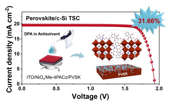钙钛矿/硅叠层电池是突破单结硅电池效率极限(~33%)的关键路径。其中,宽禁带(~1.68 eV)钙钛矿吸光层是钙钛矿/硅叠层电池的核心组件。然而,倒置p-i-n结构宽禁带钙钛矿存在固有强p型/弱n型特性,导致电子传输界面能垒高、开路电压损失显著,且薄膜结晶动力学不佳引发的形貌不均...