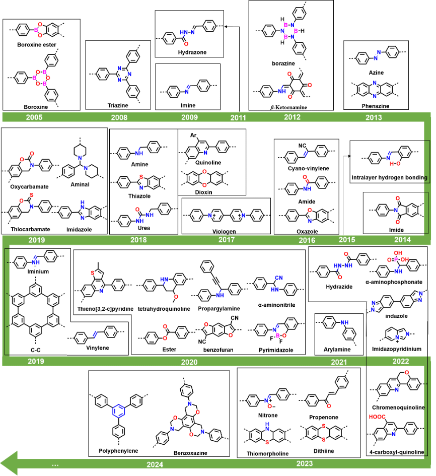 作者系统性梳理和阐述了连接键化学的核心作用及其在光/电催化应用中的最新研究进展,特别强调了连接键类型对关键性能(如结晶度、稳定性、导电性、能带结构、光生载流子分离效率及还原活性)的调控机制。论文详细回顾了二十年来近50种连接键(如硼酸酯、亚胺、腙、酮烯胺、三嗪、恶唑、二氧六环、咪唑、喹啉、硫代吗啉等)的开展历程。重点总结了连接键化学在电催化(如氧还原反应、二氧化碳还原反应、过氧化氢电合成)和光催化(如光解水制氢、光催化合成H2O2、光催化CO2RR)中的关键作用。综述也客观指出了当前连接键化学研究面临的挑战:如单晶获取困难限制了精确结构解析;新型动态共价键反应开发不足限制了结构多样性;反应过程中动态结构变化和中间体行为的原位表征难度大等。展望了机器学习结合自动化实验平台、多尺度模拟和原位先进表征技术在未来加速新型连接键结构开发和应用中的巨大潜力。