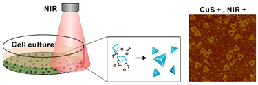 在此背景下,研究团队受近红外光热治疗的启发,利用硫化铜纳米粒子作为光热转换材料,用近红外光(NIR)照射在合成溶液中产生光热效应,以打开DNA分子的二级结构,促使其在自然冷却下形成正确的折纸结构(图1)。该方法的优势在于:DNA折纸合成速度快,整个过程仅需8分钟即可达到大于80%的产率,而传统的合成方法往往需要数小时。更重要的是,该方法可在活细胞培养环境中实现具有时空可控性的DNA折纸原位合成(图2)