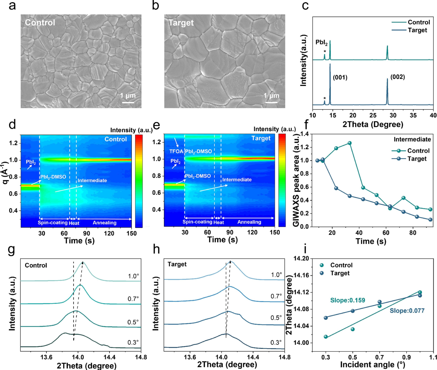 图 (a-b)对照与目标钙钛矿薄膜的SEM图像;(c)XRD图谱;(d-e)钙钛矿的原位GIWAXS图谱;(f)中间相峰面积随时间演化图;(g-i)不同入射角下的GIWAXS图谱及二维图。